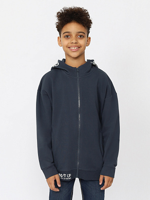 Толстовка с центральной застежкой, длинными рукавами, притачным поясом и манжетами. Манжеты выполнены из полотна с добавлением лайкры, пояс выполнен из основного полотна. Капюшон с отрезной планкой и подкладкой. На передней части расположены рельефы с карманами. Пояс декорирован принтом. Планка капюшона декорирована принтом "Стремись вперед", "Не останавливайся иди вперед".