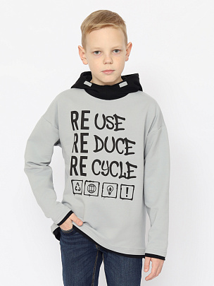 Толстовка с центральной застежкой, длинными рукавами, притачным поясом и манжетами. Манжеты выполнены из полотна с добавлением лайкры, пояс выполнен из основного полотна. Капюшон со шнурком и подкладкой контрастного цвета. Пояс декорирован вязаной нашивкой. Спина декорирована принтом "Скейтерам суждено кататься".