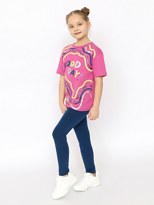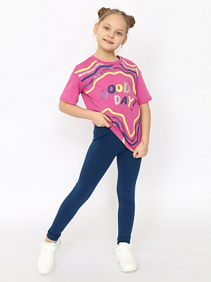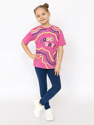 Трикотажная футболка оверсайз для девочки выполнена из мягкого хлопкового трикотажа. Свободный силуэт с заниженной линией плеча не сковывает движения. Модель дополнена круглым вырезом горловины и короткими рукавами. Перед декорирован ярким принтом с блестящим эффектом (надпись: Хорошего дня). Мягкие и комфортные лосины средней посадки с поясом на резинке.