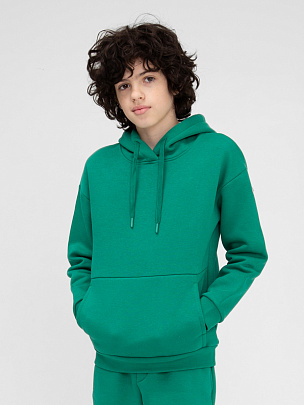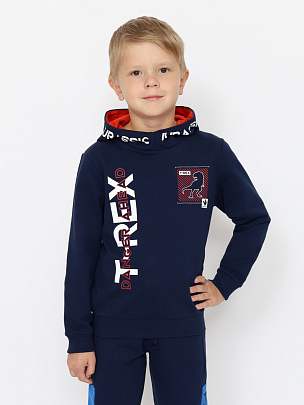 Толстовка с длинными рукавами, притачным поясом и манжетами. Манжеты и пояс выполненя из полотна с добавлением эластана. Капюшон с притачной планкой и подкладкой контрастного цвета, планка декорирована принтом. Перед декорирован принтом "тираннозавр Рекс".