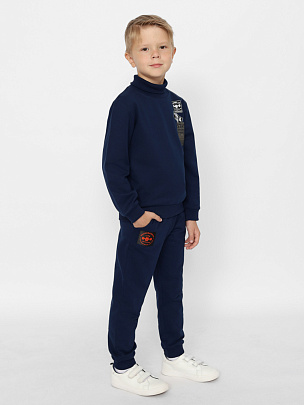 Брюки для мальчика с боковыми карманами и притачными манжетами из полотна с эластаном. Пояс притачной, с резинкой и функциональным шнуром. Спереди брюки декорированы жаккардовой этикеткой.