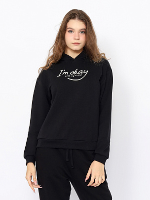 Толстовка с длинными втачными рукавами и манжетами из полотна с добавлением эластана. В нижней части толстовки расположена декоративная планка контрастного цвета. Капюшон с лицевой частью и декоративным принтом, шнурок декорирован вязаной нашивкой. Перед декорирован принтом "Панно" мир динозавров. Брюки с притачным поясом, манжетами и функциональными карманами. Пояс и манжеты выполнены из полотна с эластаном.