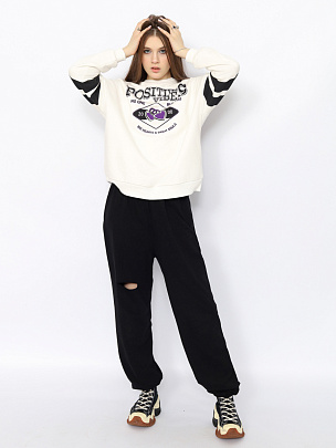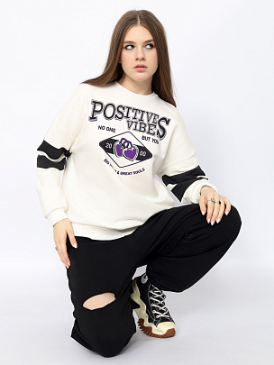 Джемпер для девушек с длинными рукавами оформлен в спортивном стиле. Свободный силуэт с заниженной линией плеча не сковывает движения. Нижние срезы переда и спинки оформлены притачным эластичным поясом. Рукава с эластичными манжетами по низу. Рукава и перед джемпера декорированы принтом "положительные эмоции".