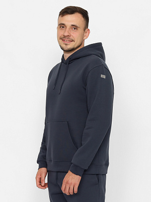 Толстовка мужская с капюшоном со шнурком, карман-кенгуру. Манжеты и пояс из эластичной рибаны. На рукаве декоративная силиконовая нашивка.